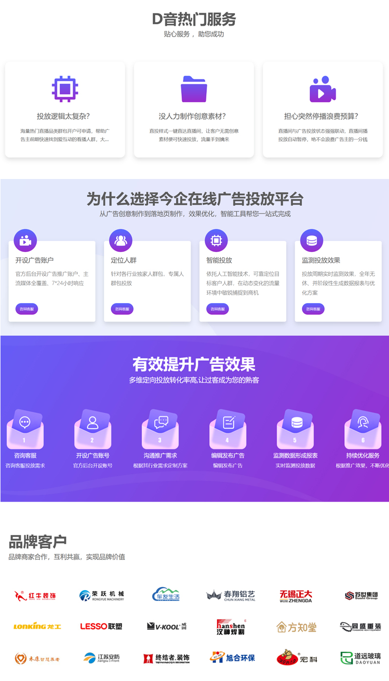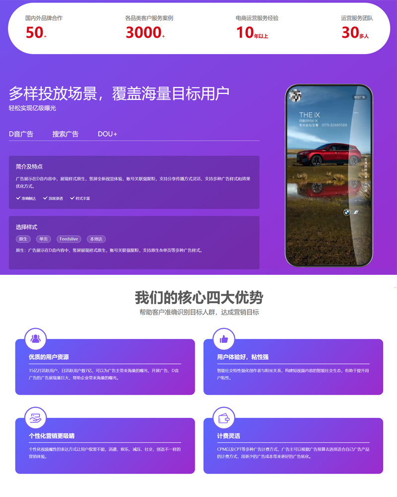 今企在线专注于新媒体平台信息流广告投放,为客户提供数据分析、账号诊断、D音巨量广告、搜索广告、DOU+,流量触达,让您的广告被更多人看见。多样投放场景,覆盖海量目标用户轻松实现亿级曝光。